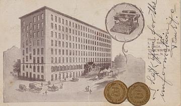 Illustrierte Postkarte; Grafik, monochrom Rückseite: Gebäudeansicht der L.C. Smith & Bros. Typewriter Co., Rundbild mit Schreibmaschine; aufgeklebt zwei Papiermünzen; beschrieben Vorderseite: adressiert an Miss Cooney, N.Y.; Poststempel Syracuse/Jan 16 1910