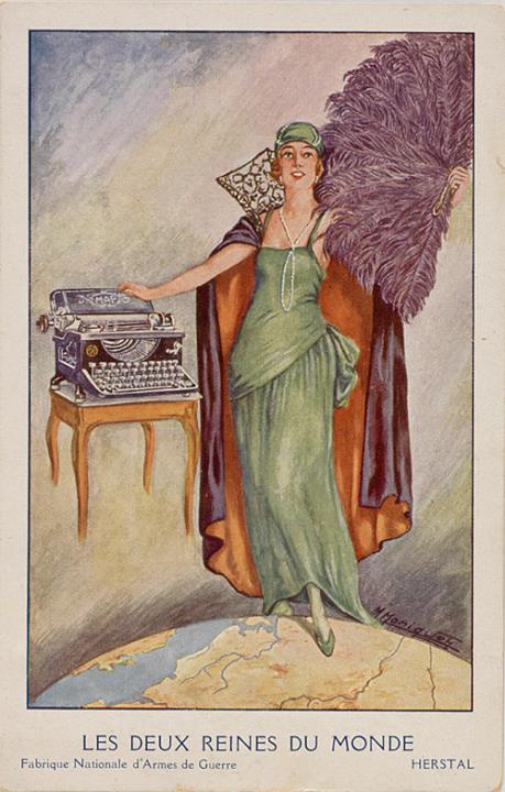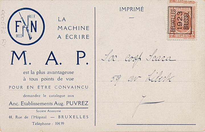 Werbepostkarte; Grafik, polychrom Rückseite: Frau in mondäner Kleidung mit Schreibmaschine MAP Vorderseite: Werbetext; adressiert an Soc. coop. Scara; Briefmarke Postes Belgique 3c; Poststempel Bruxelles/1923