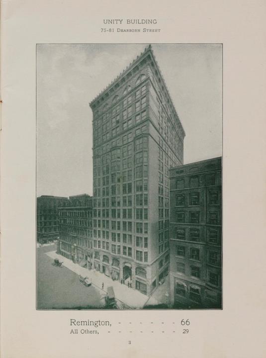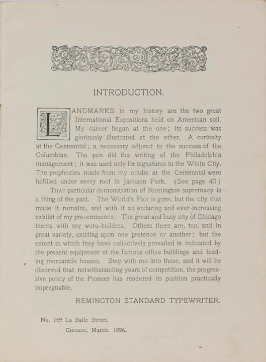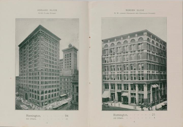 Prospekt mit Ansichten von Bürogebäuden, in denen mit Schreibmaschinen Remington gearbeitet wird, zwei Exemplare (eines fotokopiert/gebunden)