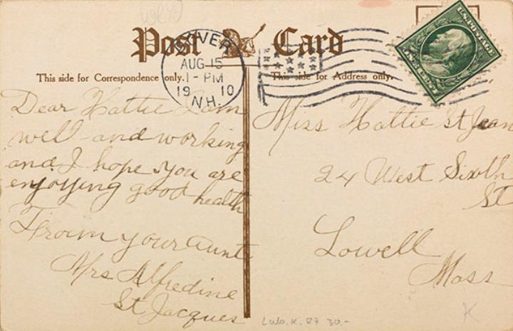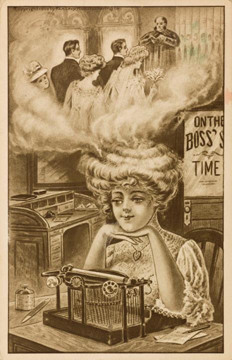 Illustrierte Postkarte; Grafik, monochrom Rückseite: Büroszene; Sekretärin mit Schreibmaschine, im Gedanken bei ihrer Hochzeit mit dem Vorgesetzten Vorderseite: beschrieben; adressiert an Miss St. Jean, Lowell; Briefmarke U.S. Postage One Cent; Poststempel Dover/Aug 15 1910