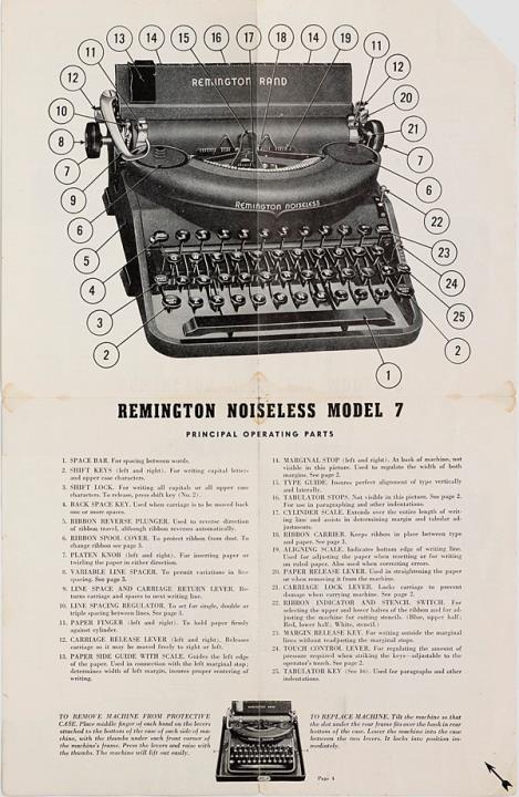 Bedienungsanleitung für Schreibmaschine Remington 7 Noiseless with a diagram of the Principal Operating Parts Nr. RP8162