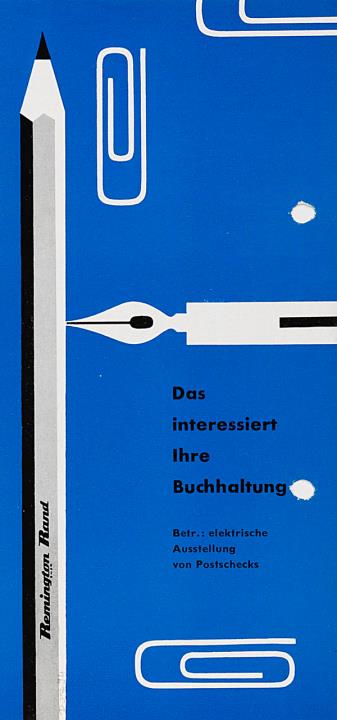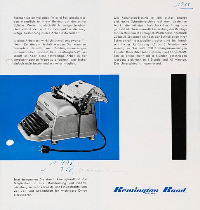 Faltprospekt für Schreibmaschine Remington Electric mit Postscheckeinrichtung Datum handschriftlich vermerkt