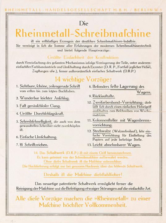 Prospekt für Schreibmaschine Rheinmetall Standard vereinigt alle Vorzüge erster Büromaschinen Sie ist erprobt und diebstahlsicher Nr. 247