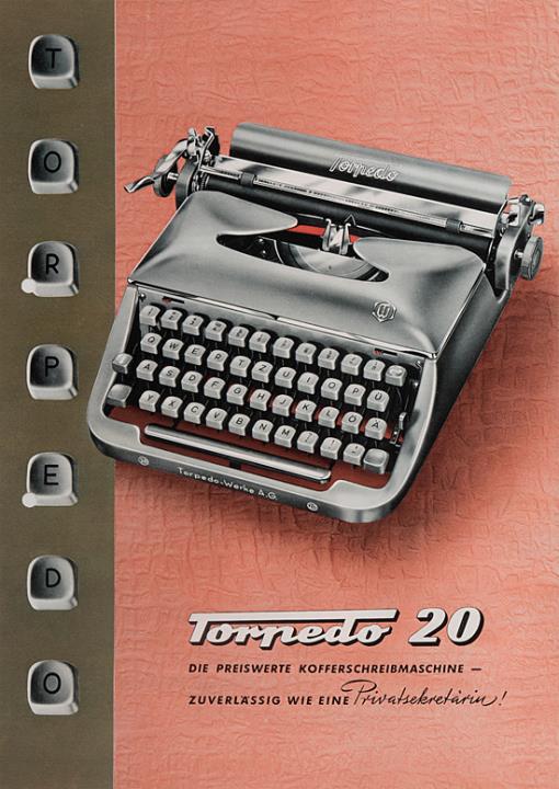 Prospekt für Schreibmaschine Torpedo 20 Die preiswerte Kofferschreibmaschine. Zuverlässig wie eine Privatsekretärin! Nr. d122.50.1155