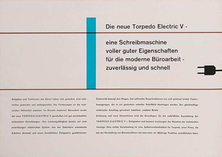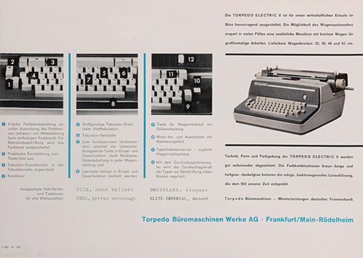 Faltprospekt für Schreibmaschine Torpedo Electric V Elektrische Funktionen im Dienste des Fortschritts Nr. d 268.50.462