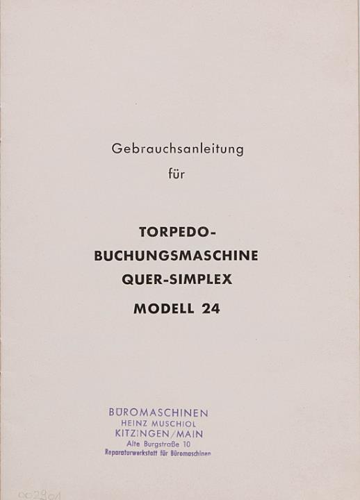 Bedienungsanleitung für Schreib- und Buchungsmaschine Torpedo Quer-Simplex 24 mit Stempel: Büromaschinen Heinz Muschiol, Kitzingen/Main