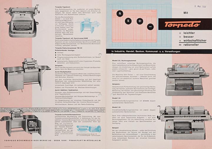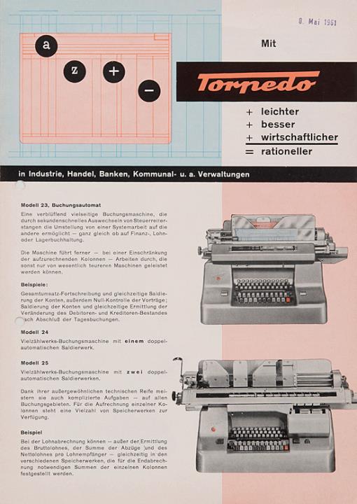 Faltprospekt für Schreib- und Buchungsmaschinen Torpedo Nr. d 245 10 3 61 mit Datumstempel versehen