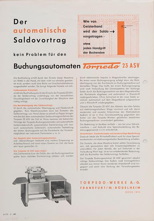 Prospekt für Schreib- und Buchungsmaschine Torpedo 23 ASV Der automatische Saldo-Vortrag Nr. d 212.5.459 mit Datumstempel versehen