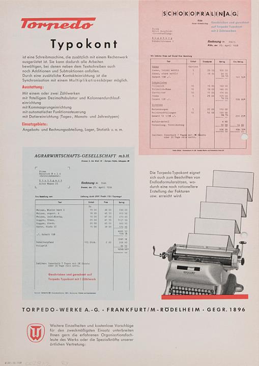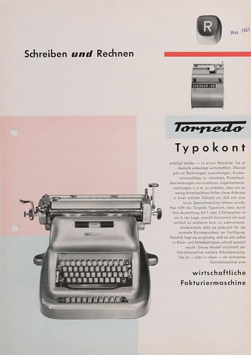 Prospekt für Schreib- und Buchungsmaschine Torpedo Typokont Nr. d 213.15.1159 mit Datumstempel versehen