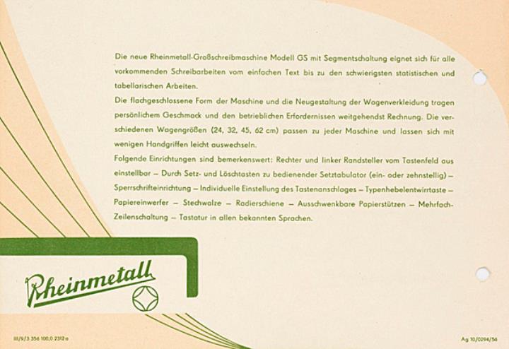 Prospekt für Büroschreibmaschine Rheinmetall GS Nr. Ag 10/0294/56