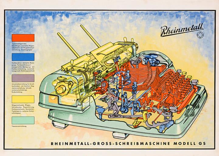 Projektionszeichnung; Funktionsquerschnitt mit farblich hervorgehobenen Bestandteilen der Schreibmaschine Rheinmetall GS Nr. V/4/59-25 (Ag 49/318/57/DDR)