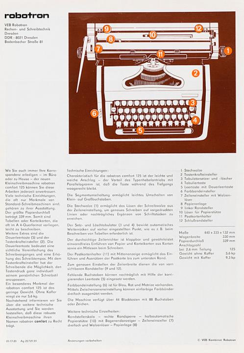 Prospekt für Schreibmaschine Robotron comfort 125 Kleinschreibmaschine mit 33-cm-Breitwagen Nr. III-17-20 Ag. 25/121/81