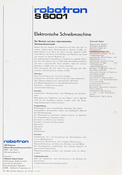 Prospekt für Büroschreibmaschine Robotron S 6001 Nr. Ag. 23/15/80 III 27 24
