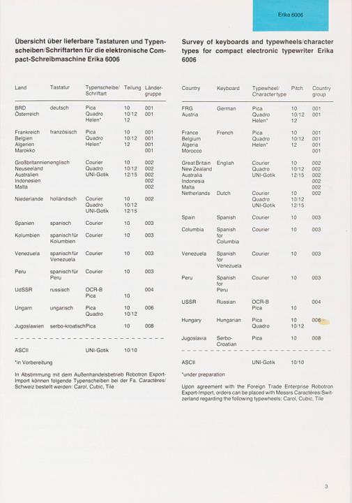 Tastaturen- und Schriftartenverzeichnis für Schreibmaschine Robotron Nr. Ag 25/20/87/III/6/15