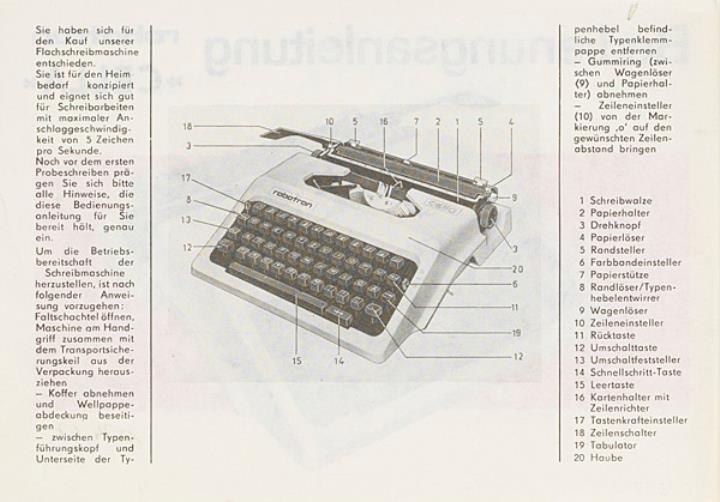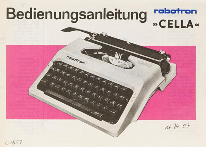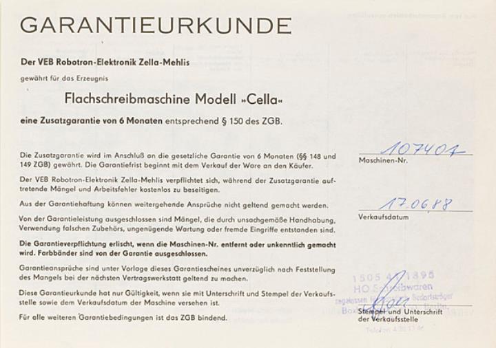Bedienungsanleitung für Schreibmaschine Robotron Cella mit Garantieurkunde vom 17.06.88 für Maschine Nr. 107407; Nr. V-20-15 40SG 139/50/86 1404