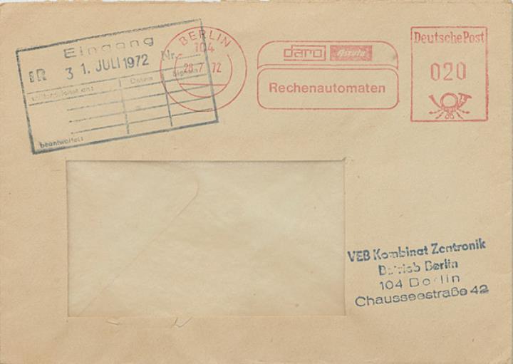 Briefumschlag mit Absenderfreistempel des Büromaschinenherstellers VEB Zentronik Stempel: Berlin/28.07.1972, Werbung daro Ascota Rechenautomaten, Wert Deutsche Post 20 Pf.