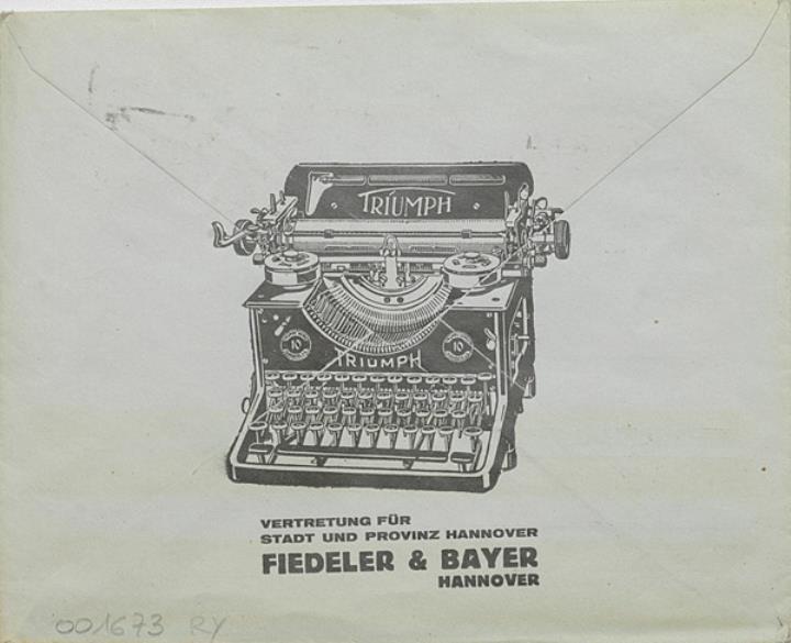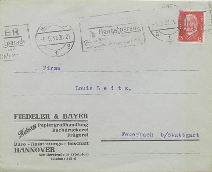 Briefumschlag mit Firmendruck der Bürowarenhandlung Fiedler & Bayer, Hannover und rückseitigem Werbedruck für Schreibmaschine Triumph adressiert (Maschinenschrift) an Firma Leitz, Feuerbach; Briefmarke Deutsches Reich 15 RPf., Poststempel Hannover/05.09.1931