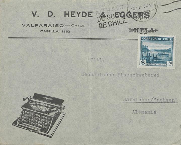 Briefumschlag mit Firmendruck der Schreibmaschinenhandlung V. D. Heyde & Eggers adressiert (Maschinenschrift) an Titl. Mechanische Plüschweberei, Hainichen; Briefmarke Correos Chile 1.80; Poststempel 03.01.19x9