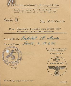 Schreibmaschinen-Bezugsschein der deutschen Wehrmacht Serie B St. N. 015549, datiert 14.09.1940 ausgebende Stelle: Bezirkswirtschaftsamt für den Wehrwirtschaftsbezirk XIII in Fürth Handschrift, mit Stempel