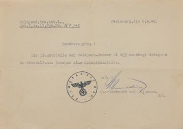 Bestellschreiben der Feldgendarmerie-Ersatz-Abteilung 1 für eine Schreibmaschine datiert Perleberg, 08.04.1942 Maschinenschrift, unterschrieben