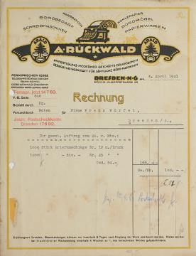 Rechnung Nr. VB 640 der Bürowarenhandlung A. Rückwald, Dresden adressiert an Firma Franz Würfel, Dresden; datiert 04.04.1921 Maschinenschrift