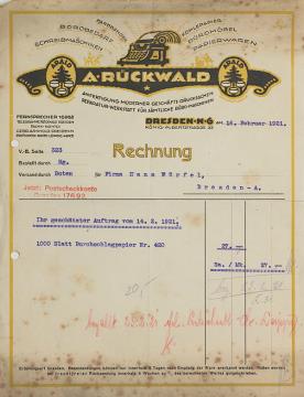 Rechnung Nr. VB 323 der Bürowarenhandlung A. Rückwald, Dresden adressiert an Firma Hans Würfel, Dresden; datiert 16.02.1921 Maschinenschrift