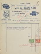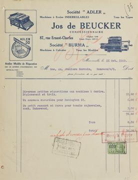 Rechnung der Schreibmaschinenhandlung Jos de Beucker, Marcinelle adressiert an Soc. An. Ateliers Germein, Monceau; datiert 24.10.1929 Maschinenschrift, mit Gebührenmarken