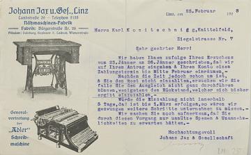 Mahnschreiben der Nähmaschinenfabrik/Schreibmaschinenhandlung Johann Jax, Linz a. D. adressiert an Herrn Konitschnigg, Knittelfeld; datiert 15.02.1928 Maschinenschrift, unterschrieben