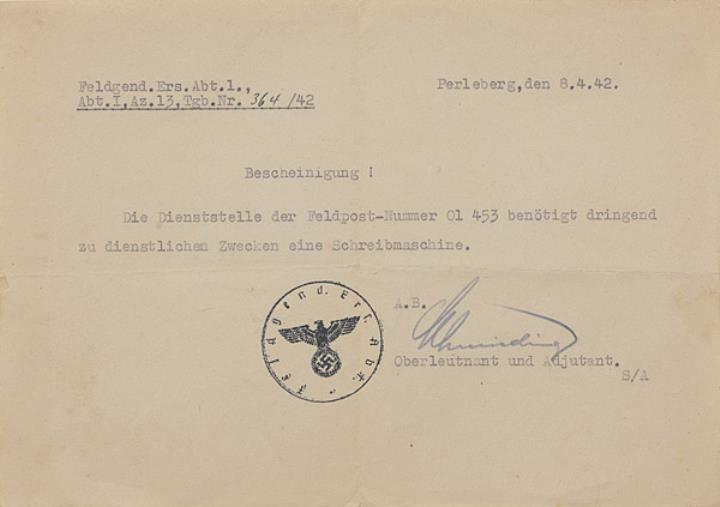 Bestellschreiben der Feldgendarmerie-Ersatz-Abteilung 1 für eine Schreibmaschine datiert Perleberg, 08.04.1942 Maschinenschrift, unterschrieben