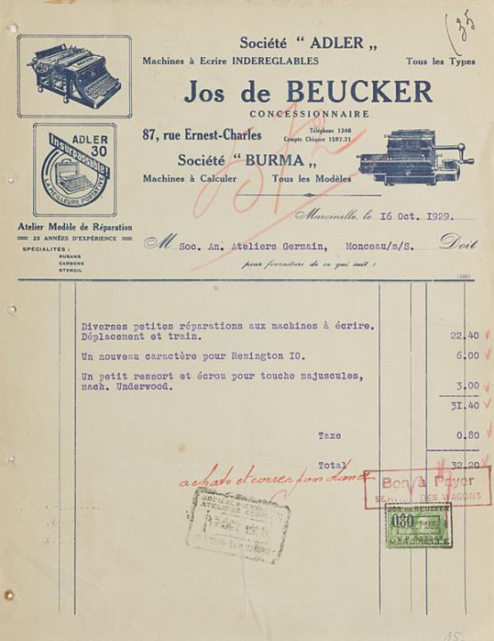 Rechnung der Schreibmaschinenhandlung Jos de Beucker, Marcinelle adressiert an Soc. An. Ateliers Germein, Monceau; datiert 16.10.1929 Maschinenschrift, mit Gebührenmarke