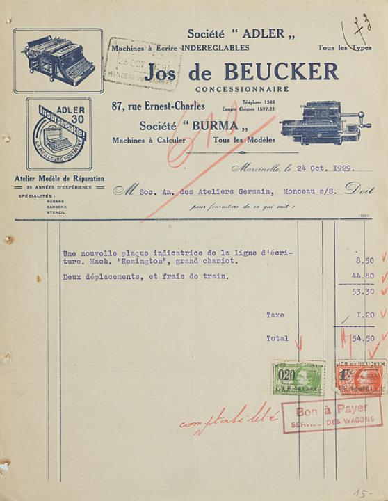 Rechnung der Schreibmaschinenhandlung Jos de Beucker, Marcinelle adressiert an Soc. An. Ateliers Germein, Monceau; datiert 24.10.1929 Maschinenschrift, mit Gebührenmarken
