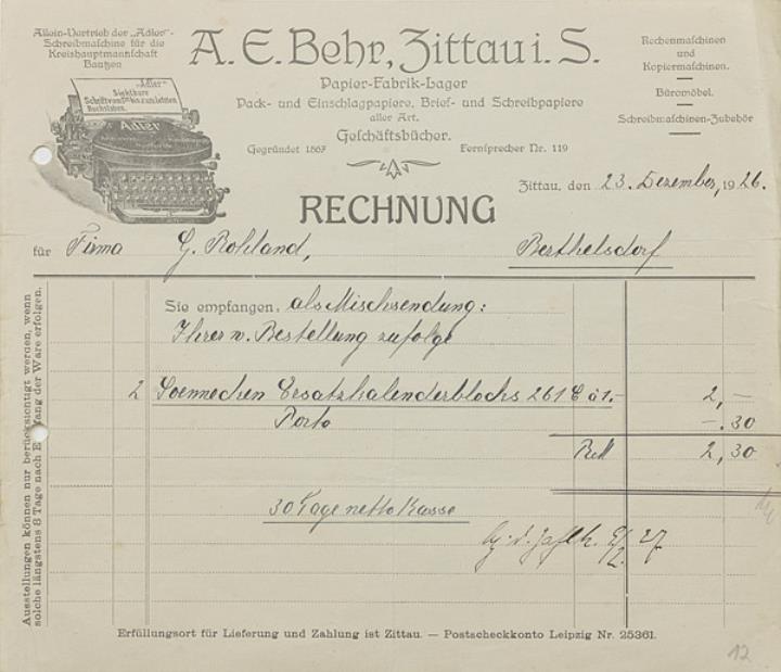 Rechnung der Schreibmaschinenhandlung A. E. Behr, Zittau i. S. adressiert an Firma G. Bohland; datiert 23.10.1926 Handschrift