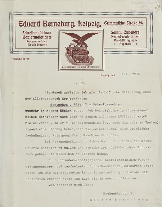 Werbeschreiben der Schreibmaschinenhandlung Eduard Berneburg, Leipzig; datiert Mai 1910 Maschinenschrift