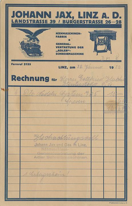 Rechnung der Nähmaschinenfabrik/Schreibmaschinenhandlung Johann Jax, Linz a. D.; datiert 30.01.1932 Handschrift