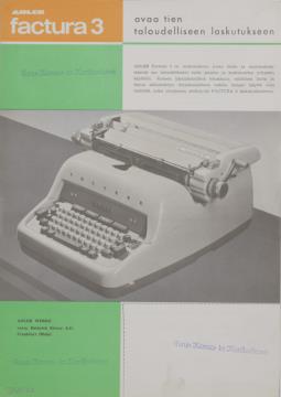 Prospekt in finnischer Sprache für die Schreib- und Fakturiermaschine Adler Factura 3. factura 3 avaa tien taloudelliseen laskutukseen