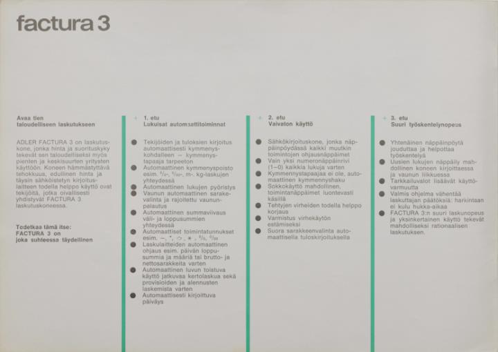 Prospekt in finnischer Sprache für Schreib- und Fakturiermaschine Adler Factura 3