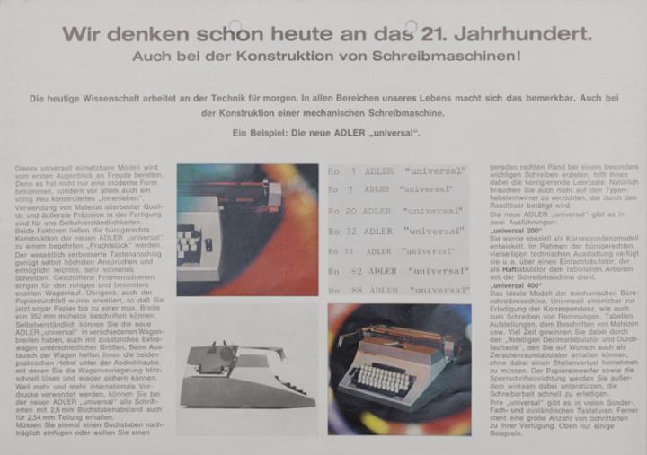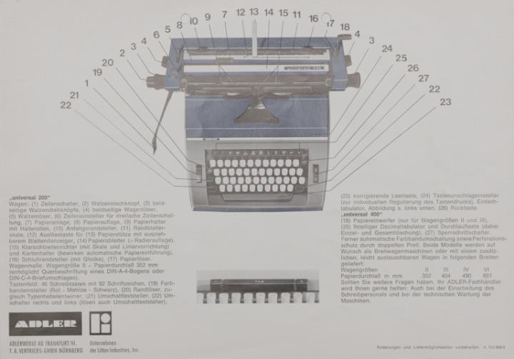 Faltprospekt für Adler Schreibmaschine universal 200 und universal 400 Nr. A 764/969/6 Datum handschriftlich vermerkt