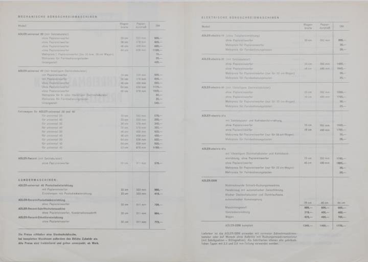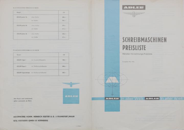 Faltprospekt mit Adler Schreibmaschinen Preisliste Händler-Verrechnungs-Preisliste Ausgabe Mai 1965 Nr. A 178/565/6