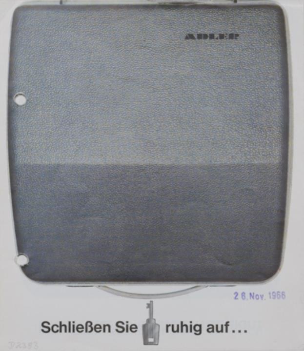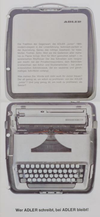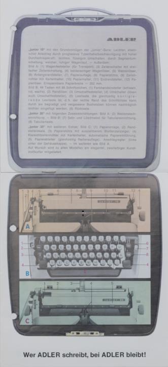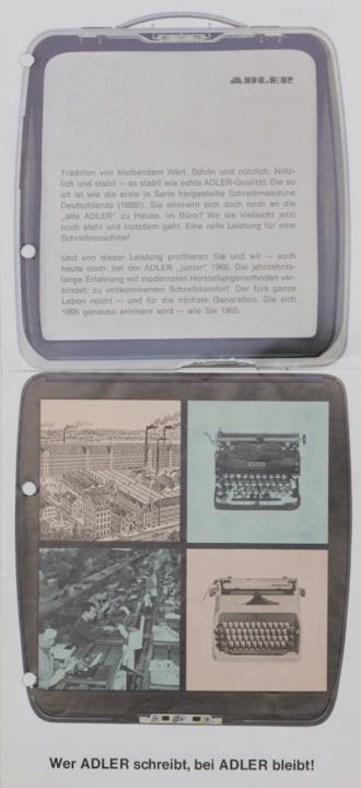 Prospekt für Schreibmaschine Adler junior mit Koffer Nr. A 586/465/6 mit Datumstempel versehen