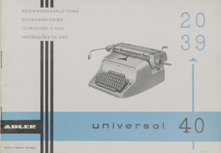 Bedienungsanleitung in vier Sprachen für Schreibmaschine Adler universal 20, univeral 39 und universal 40 Nr. A 574/965/17 deutsch, ital., port., dän.