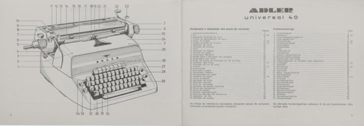Bedienungsanleitung in vier Sprachen für Schreibmaschine Adler universal 20, univeral 39 und universal 40 Nr. A 574/466/17 deutsch, ital., port., dän.