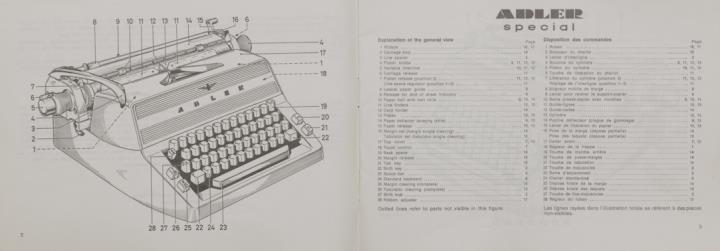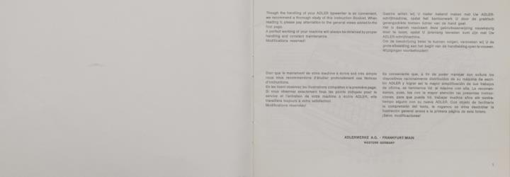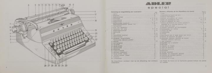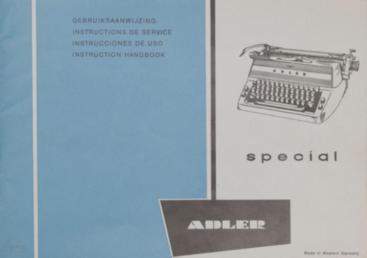 Bedienungsanleitung in vier Sprachen für Schreibmaschine Adler Special Nr. A 622/468/17/3. engl., franz., holl., span.
