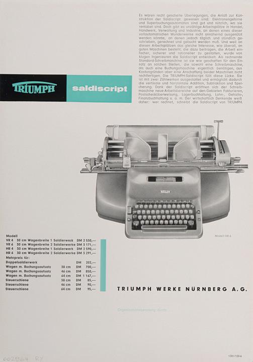 Faltprospekt für Schreib- und Buchungsmaschine Triumph Saldiscript Nr. 1281/158-6