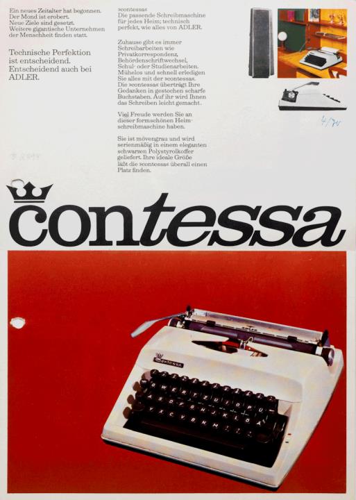 Faltprospekt für Schreibmaschine Adler contessa Nr. A 813/370/6 Datum handschriftlich vermerkt