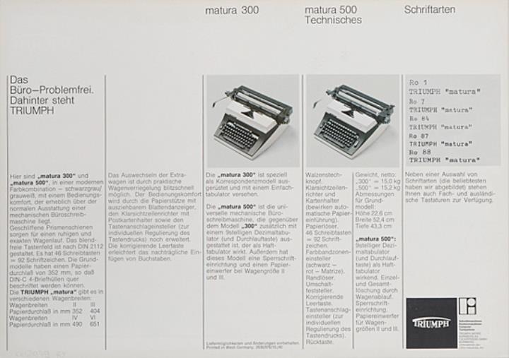 Prospekt für Schreibmaschine Triumph Matura 300, 500 mechanische Büroschreibmaschine Nr. 2636/976/10./40