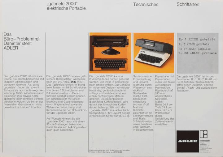Prospekt für Schreibmaschine Adler gabriele 2000 Nr. A 1/977/5./23
