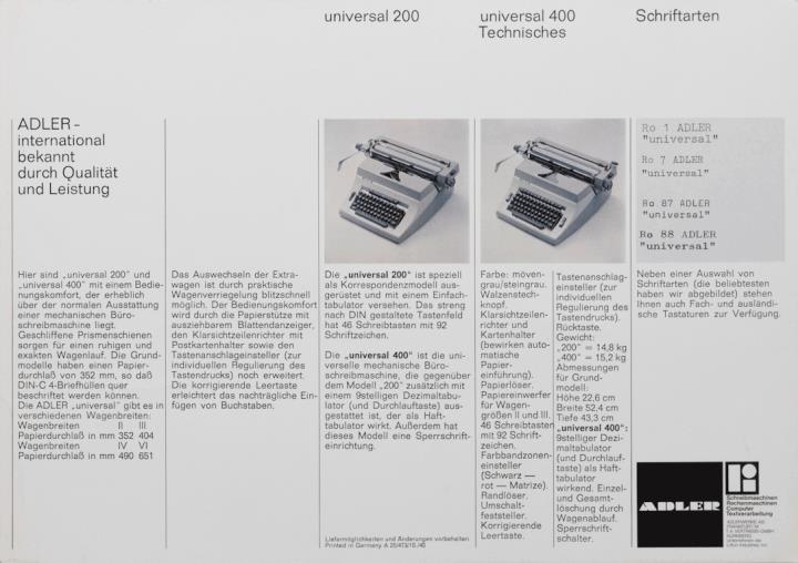 Prospekt für Schreibmaschine Adler universal 200/400 mechanische Büroschreibmaschine Nr. A 25/473/10./40