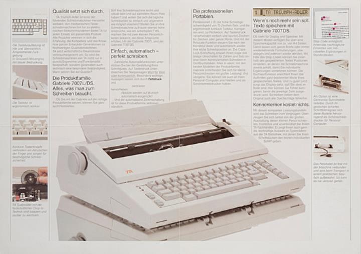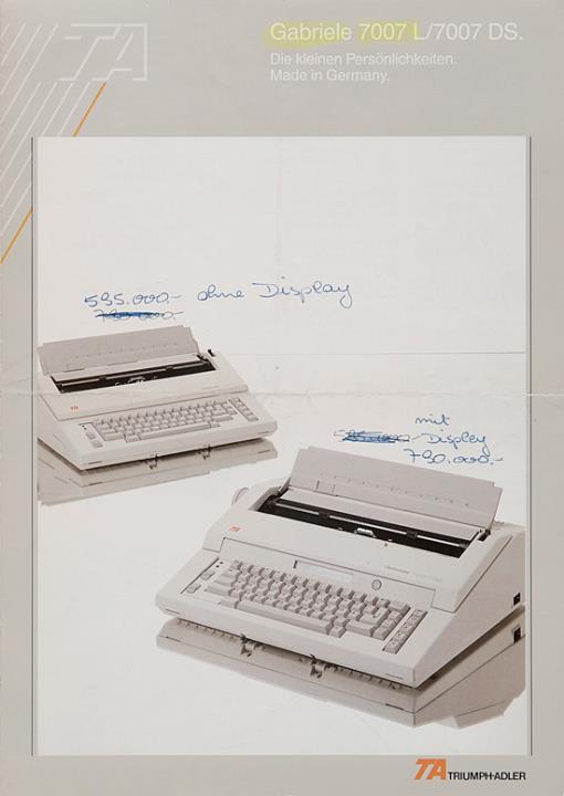 Faltprospekt für Schreibmaschine Triumph-Adler Gabriele 7007 Die kleine Persönlichkeiten. Made in Germany Nr. WE 01128901/0791/20/20 Beilage: TA Original Zubehör, Verschiedene Typenträger mit handschriftlichem Vermerk