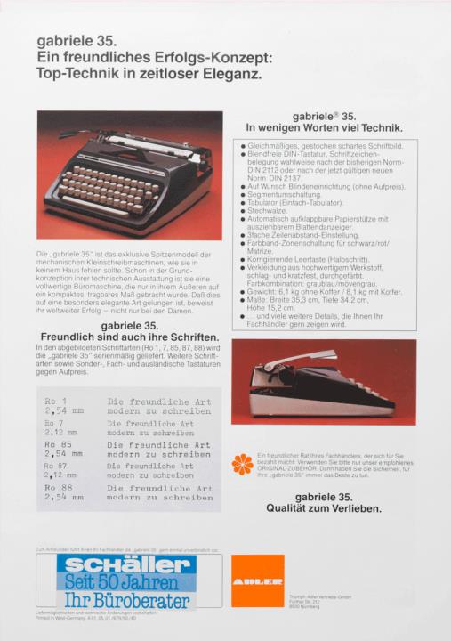 Prospekt für Schreibmaschine Adler gabriele 35. Die freundliche Art, schöner zu schreiben. Kompakter Komfort - elegant verpackt. Nr. A 01.05.01./679/50./40