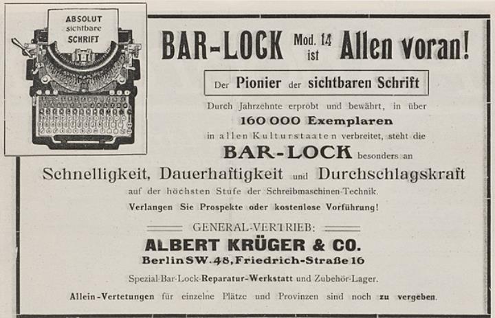 Werbeanzeige für Schreibmaschine Bar-Lock monochrom